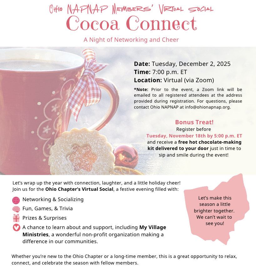 « All Events Ohio Virtual Social (Members Only) December 2 @ 7:00 pm - 8:30 pm EST Free « OAAPN 34th Annual Statewide Conference VIRTUAL – Treatment of Molluscum Contagiosum: Zelsuvmi (berdazimer) » Register Now! Registration Required (using your NAPNAP member ID)! Add to calendar Google Calendar iCalendar Outlook 365 Outlook Live Details Date: December 2 Time: 7:00 pm - 8:30 pm EST Cost: Free Website: https://www.eventbrite.com/e/cocoa-connect-a-night-of-networking-and-cheer-tickets-1927204684089?aff=oddtdtcreator Venue Virtual Organizer Ohio NAPNAP